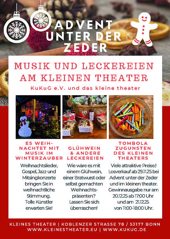 Die Lose gibt es ab dem 29.11.2025 bei jeder Veranstaltung von Advent unter der Zeder, jeden Tag im kleinen theater und wir werden auch wieder in der Innenstadt aktiv sein.
