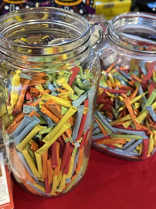 Also achtet auf die großen Gläser mit den bunten Losen.
