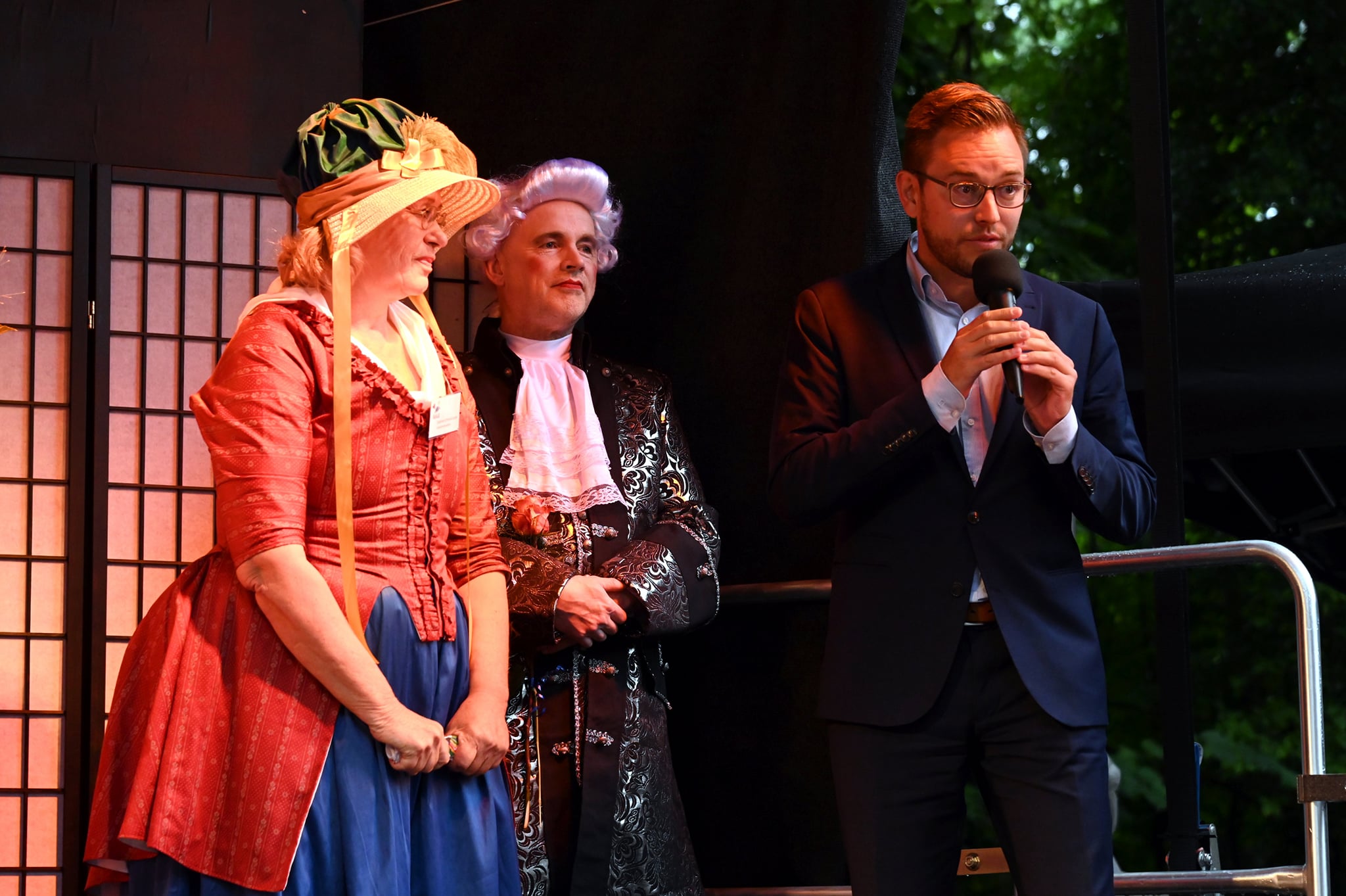 Die historischen Fechter des Jardin des Epoques e.V. zeigen ein - nicht ganz so ernstes - Duell unter Ehrenmännern, wie es sich zur Zeit Beethovens zugetragen haben könnte. Was wohl die Bergischen Landjäger dazu sagen werden, die das Gelände patrouillieren und für Ruhe und Frieden sorgen sollen?